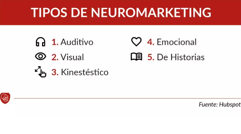 Los tipos de neuromarketing pueden categorizarse de acuerdo a los sentidos del ser humano. En este caso hablamos del auditivo, visual, kinestésico, y añadimos el contacto emocional y el vínculo histórico.